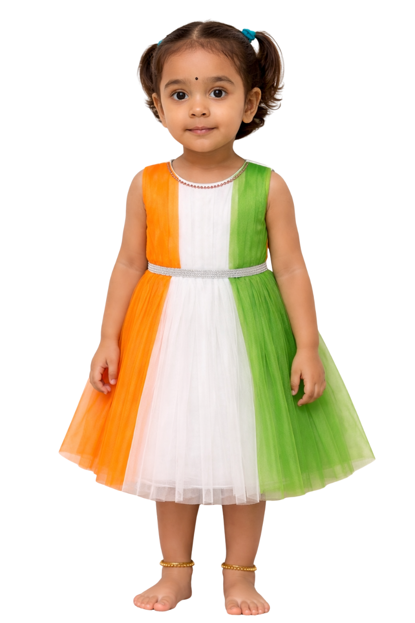 Beautiful tricolor frock for baby girls, perfect for Independence Day, Republic Day, school functions, and celebrations. Soft fabric, comfortable fit, and attractive design.